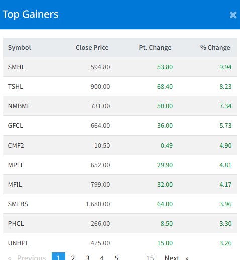 आज सबैभन्दा धेरै सुपर मादी हाइड्रोपावरका लगानीकर्ताले कमाएका छन् । आज यस कम्पनीका लगानीकर्ताले ९ दशमलव ९४ प्रतिशतका दरले कमाएका छन् । थ्रि स्टार हाइड्रोका लगानीकर्ताले ८ दशमलव २३ प्रतिशतका दरले कमाएका छन् । एनएमबि माइक्रोफाइनान्सका लगानीकर्ताले ७ दशमलव ३४ प्रतिशतका दरले कमाएका छन् ।