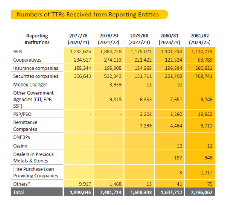 सहकारी क्षेत्रले ३६ वटा रिपोर्टमार्फत ६ करोड ५६ लाख ८० हजार रुपैयाँ र विप्रेषण (रेमिट्यान्स) कम्पनीहरुले १०० वटा रिपोर्टमार्फत २८ करोड ५६ लाख ४० हजार रुपैयाँको कारोबार विवरण जानकारी गराएका छन्।