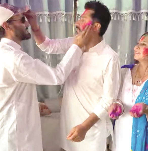 अभिनेता आयुष्मान देशराज जोशी र अभिनेत्री प्रियंका कार्कीको परिवार रंग खेलेर रमाउउँदै ।