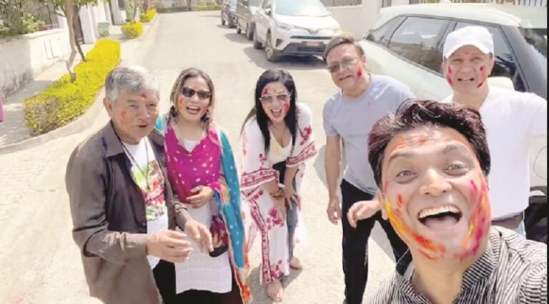 अभिनेता बाबु छोरा मदनकृष्ण श्रेष्ठ र यमन श्रेष्ठ परिवार तथा कोलनीका सदस्यहरुका साथ फागु खेल्दै।