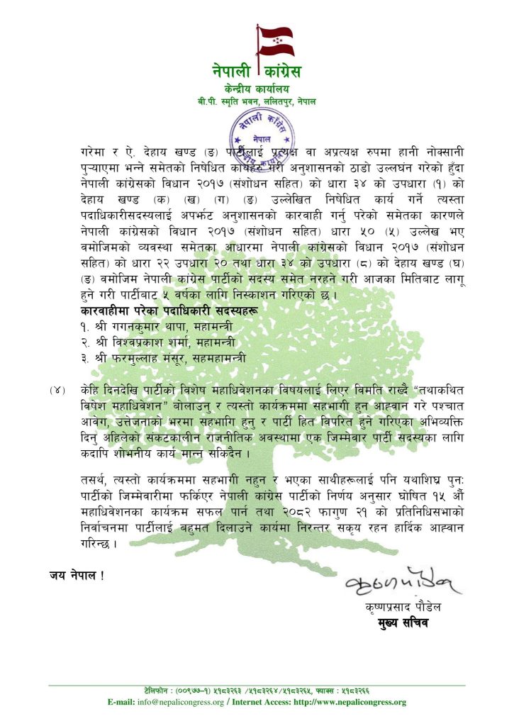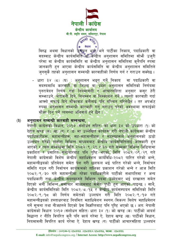 बुधबारको केन्द्रीय समितिको निर्णयमा भनिएको छ, ‘अनुशासन भङ्ग गर्ने निकाय वा पदाधिकारी वा सदस्यमाथि कारबाही वा जिल्ला वा प्रदेश अनुशासन समितिको निर्णयमा पुनरावेदन निर्णय गर्दा नियमावली र आचारसंहिता अनुसार कसुर हेरी सम्झाउने, चेतावनी दिने, निलम्बन वा निष्कासन गर्ने।’