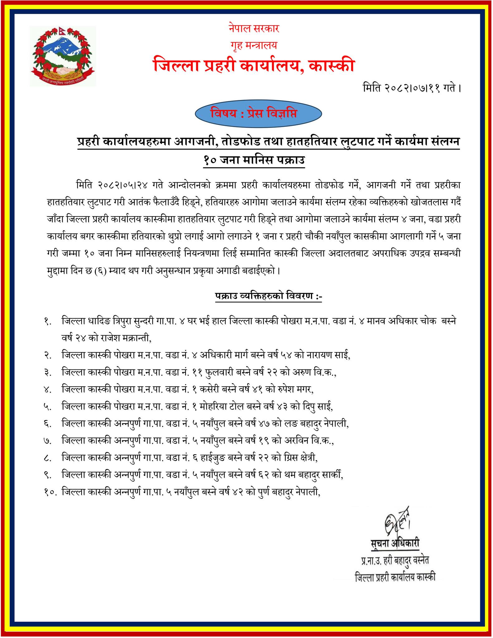 पोखरा । कास्कीमा जेन-जी आन्दोलनका क्रममा विभिन्न प्रहरी कार्यालयमा आगजनी, तोडफोड र हतियार लुटपाट गर्ने घटनामा संलग्न १० जनालाई जिल्ला प्रहरी कार्यालय कास्कीले पक्राउ गरेको छ ।