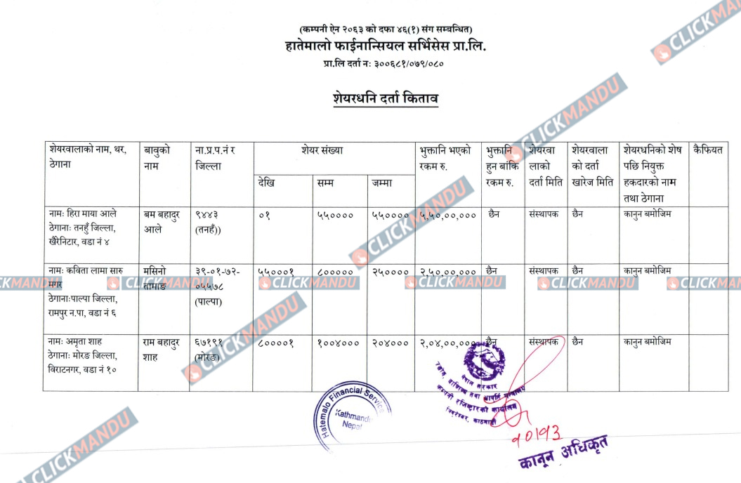 धितोपत्र बोर्डको प्रारम्भिक अध्ययन रिपोर्टले हातेमालो फाइनान्सियल सर्भिसेसलाई पनि कारबाही सिफारिस गरेको छ । हातेमालो फाइनान्सियल सिर्भिसेसले ज्योति अग्रवालको ग्राहक परिचय विवरण सम्पत्ति शुद्धीकरण निवारण ऐन, २०६४ को व्यवस्था बमोजिम अन्य व्यक्तिको तर्फबाट व्यवसायिक सम्बन्ध स्थापना तथा कारोबार गर्ने व्यक्तिको पहिचान तथा सम्पुष्टि नगरेको देखिएको औंल्याएको छ । जसबाट कर्पोरेट डेभलपमेन्ट बैंकको अन्तिम मूल्य ११६.८३ रुपैयाँले वृद्धि हुने वातावरण तयार भएको देखिएकोले हातेमालो फाइनान्सियल सिर्भिसेसलाई सम्पत्ति शुद्धीकरण निवारण ऐन, २०६४ को दफा ७फ को उपदफा (१) को खण्ड (ख) बमोजिम १० लाख रुपैयाँ जरिवाना गर्न सिफारिस गरेको छ ।