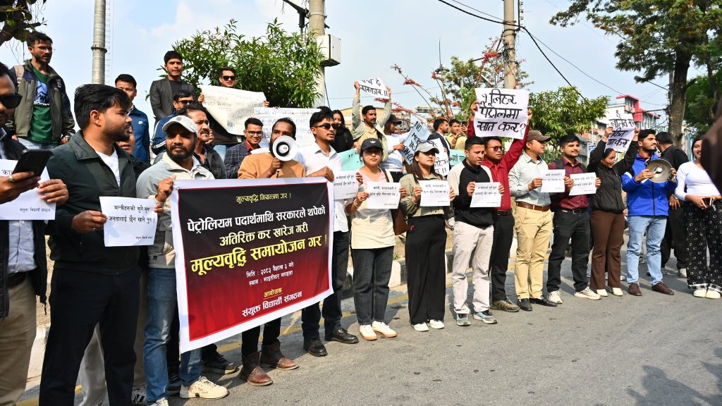 काठमाडौं । पेट्रोलियम पदार्थको मूल्य वृद्धि र बढ्दो महंगीलाई लिएर संयुक्त विद्यार्थी युनियनले प्रदर्शन गरेको छ।